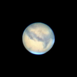 Mars longitude 255°, south is up, note the blue haze of morning clouds over Syria, the south polar cap is just a speck.