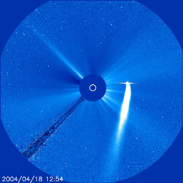 Comet C/2004 F4 Bradfield as it passed through SOHO’s C3 coronagraph’s field of view on April 18, 2004. It created quite a sensation with its bright head and long white tail trailing behind it. The coronagraph blocks out the Sun’s intense light to allow us to see faint objects in the corona. No one really knew how bright it would be and no one was disappointed. This comet continued on past the Sun and out into space.