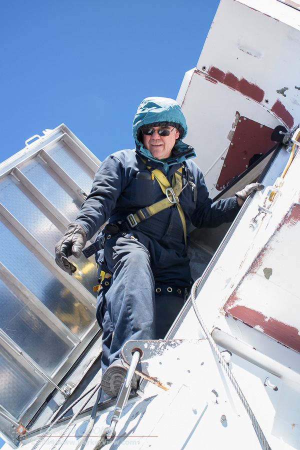 Keck engineer Mike Dahler works inside the upper shutter to replace a wire rope