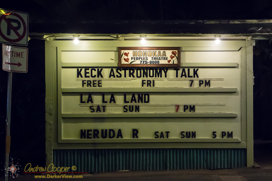 The Honokaʻa People’s Theater marquee advertising an astronomy lecture sponsored by the W. M. Keck Observatory