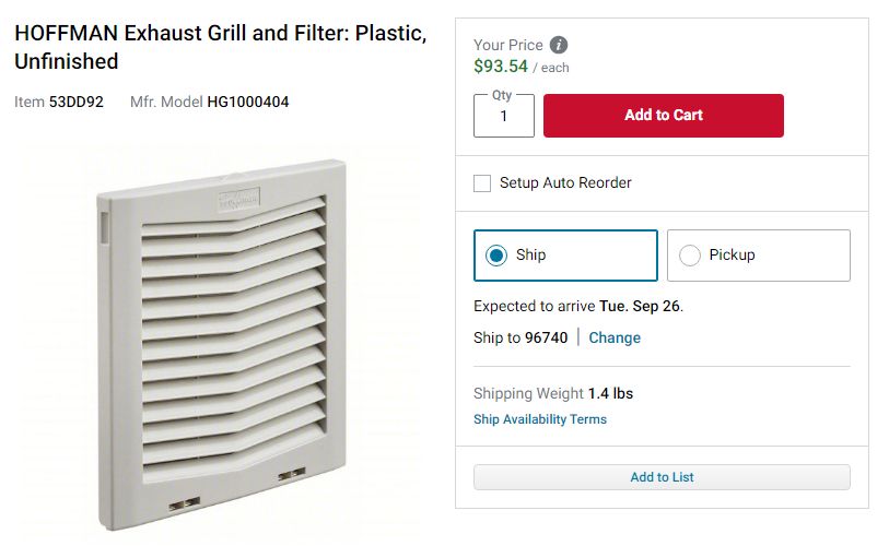 Previous Image Next Image A Fan Grill for $93?? A Fan Grill for $93?? A Hoffman Fan Grill for $93 from Grainger? Yes, this is three bits of plastic for almost $100.